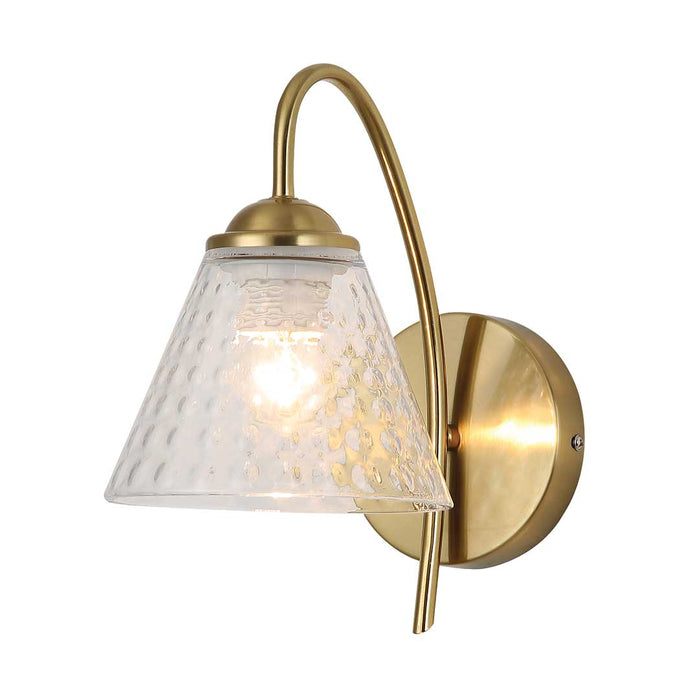 The Modern Hammered Clear Glass Wall Bracket Light with Brass Finish features a sleek and sophisticated design, blending contemporary aesthetics with timeless brass accents. Its hammered clear glass cone shade adds a subtle texture that softly diffuses light, creating a warm and inviting ambiance in any space. Ideal for bedrooms, hallways, staircases, or living areas, this elegant fixture is engineered for both performance and durability, operating efficiently across a wide voltage range and extreme temperature conditions. A perfect balance of function and style, it enhances both classic and modern interiors with a refined touch.