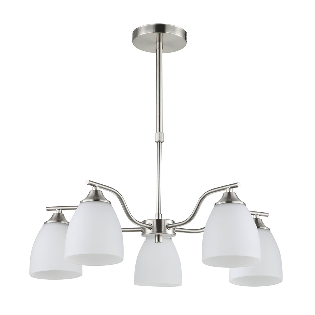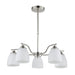 Enhance your space with this elegant silver and white 5-light pendant, featuring gracefully curved arms and frosted glass shades. Perfect for dining rooms, living areas, bedrooms, or reception spaces, this pendant combines sophisticated design with practical lighting. It supports five E27 bulbs up to 60W each and is built for durability, performing reliably even in extreme temperatures.