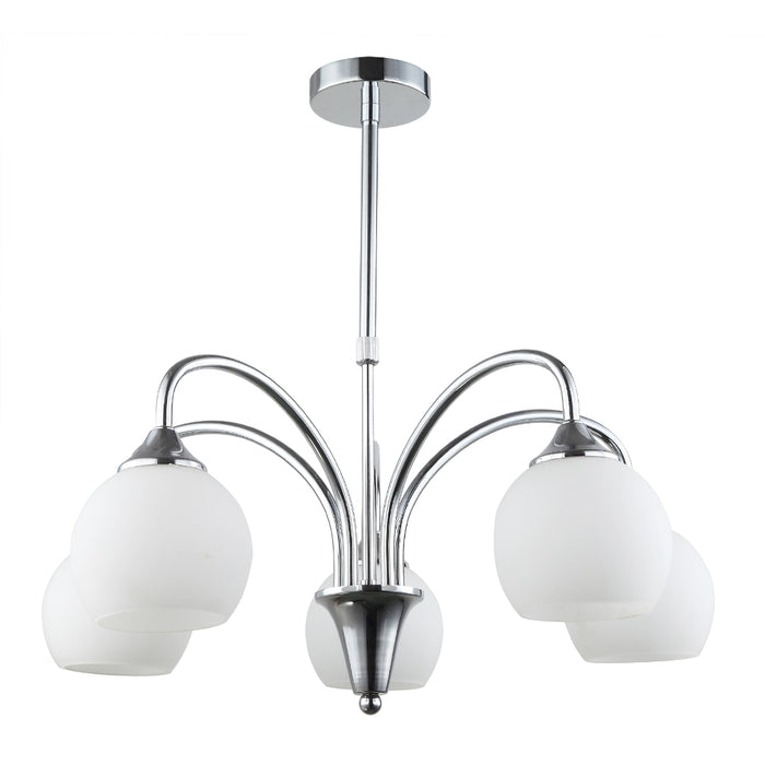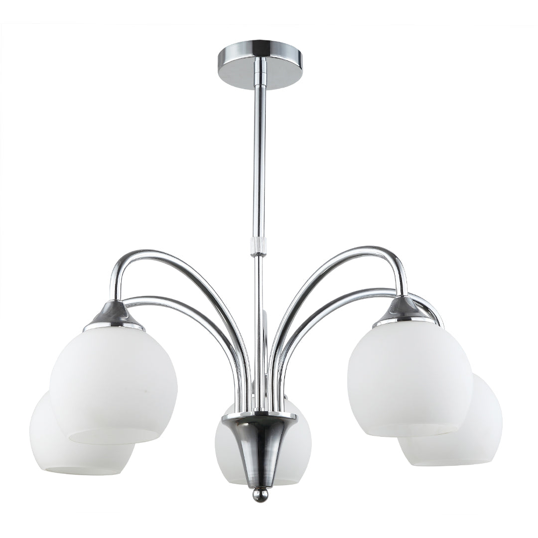 Enhance your space with a touch of elegance using this beautifully designed 5-light pendant lamp in silver and white. Its gently curved iron arms extend from a sleek silver mount, supporting five soft frosted glass shades that offer warm, ambient light. This fixture is perfect for adding sophistication to living rooms, dining areas, or reception spaces. It accommodates 5 x E27 bulbs up to 60W and works with both LED and conventional types, offering flexibility and energy efficiency. The durable iron and glass construction ensures strength and longevity, while the neutral tones fit effortlessly into modern or classic interiors. Designed for indoor use, it’s protected with an IP20 rating and built to perform in a wide temperature range from -40°C to +60°C. Whether you're creating a cozy dining setup or highlighting a hallway, this pendant blends functionality and beauty with ease.